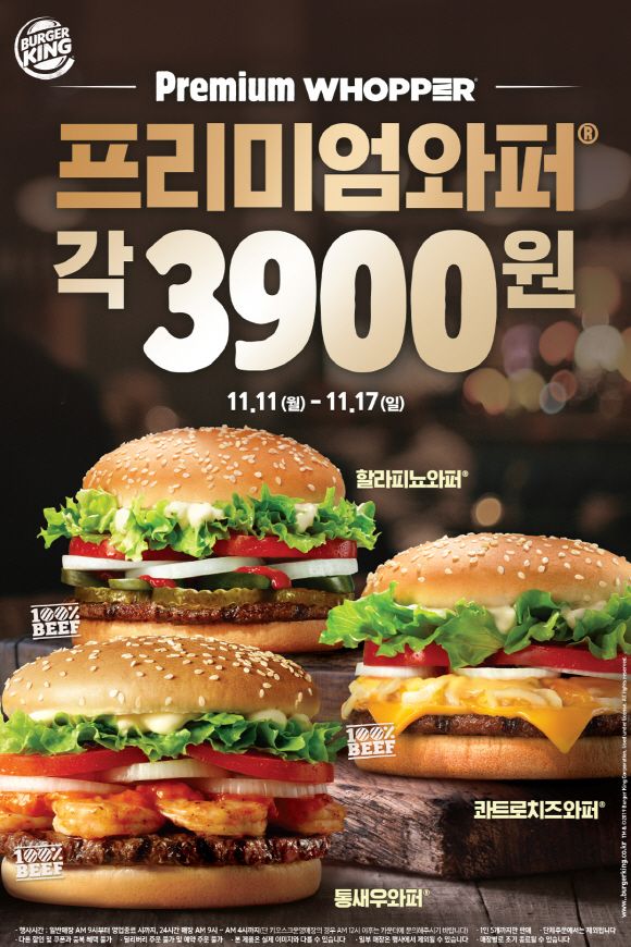 프리미엄 와퍼 3종 3900원 할인 판매 프로모션은 딜리버리 서비스와 일부 매장을 제외한 전국 버거킹 매장에서 진행되며 1인당 최대 5개까지 구매할 수 있다. 다른 할인 및 쿠폰과 중복 혜택은 적용되지 않는다.