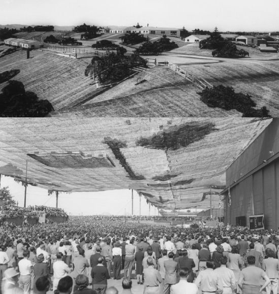 제2차 세계대전 당시 미국 캘리포니아의 교외 한 마을의 모습(사진 위). 그러나 이 마을은 록히드마틴의 군수공장입니다(아래). 이렇게 많은 사람들이 위장막으로 가려진 곳 아래서 일하고 있었습니다.[사진=www.lockheedmartin.com]
