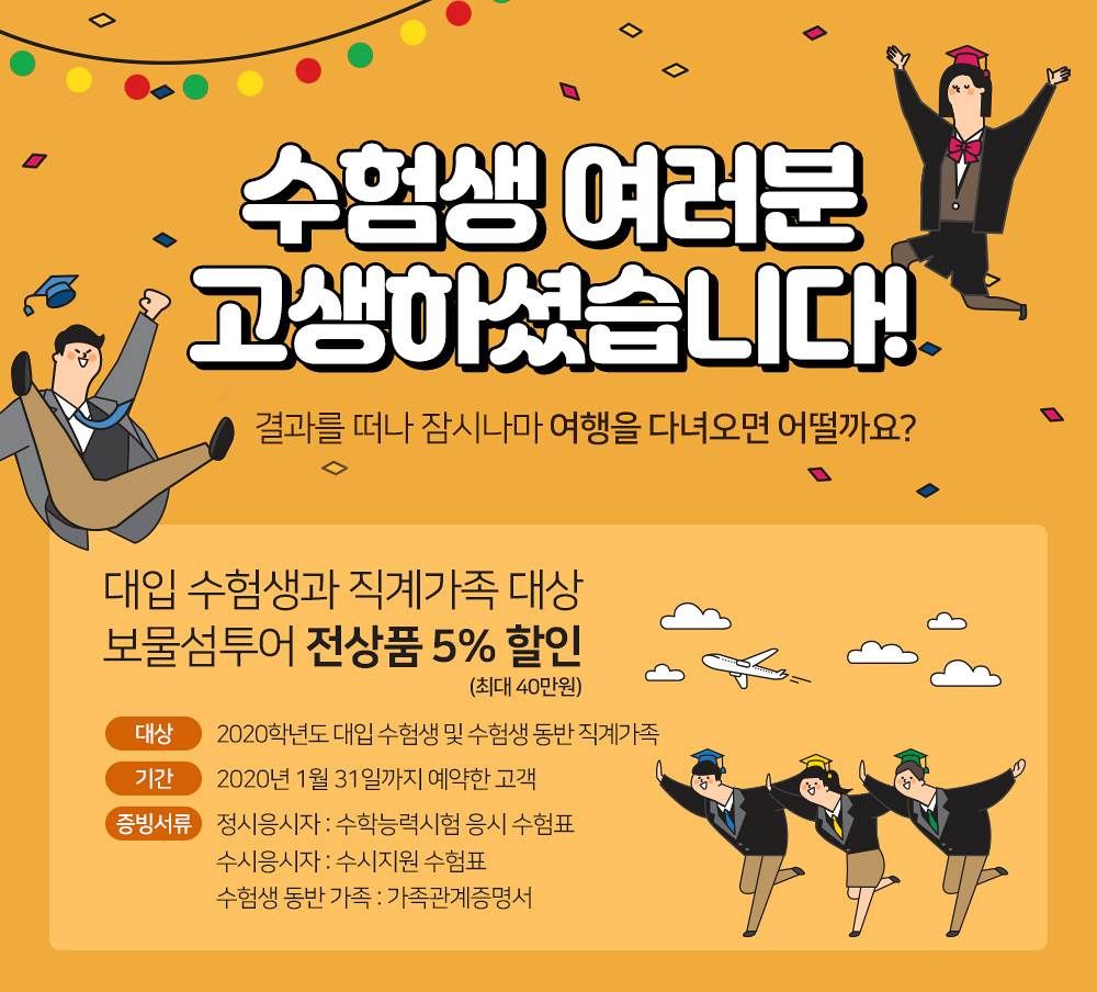 할인 방법은 예약 시 추가 요청사항에 '수험생 할인 5% 적용 요청'을 입력하고 상품 담당자에게 문자 또는 이메일로 수험표를 제시하면 된다. 보다 자세한 사항은 보물섬투어 홈페이지를 통해 확인할 수 있다.