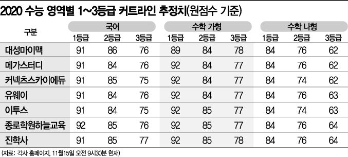 [아시아경제 조인경 기자] 2020학년도 대학수학능력시험 가채점 결과, 현재 입시업체들은 국어영역에서 원점수 91∼92점 이상이면 1등급(상위 4% 이내)을 받을 것으로 예상했다. 대성마이맥ㆍ메가스터디교육ㆍ유웨이ㆍ이투스ㆍ진학사ㆍ커넥츠스카이에듀 등이 제시한 1등급 커트라인은 91점, 종로학원하늘교육은 92점이다.