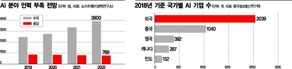 또 국가별 글로벌 AI 인재 수를 봐도 미국은 2만8536명, 중국은 1만8232명으로 조사된 반면 한국 2664명이었다. 캐나다 연구기관인 엘리먼트 AI가 집계한 박사급 이상의 AI 전문가 수에서도 우리나라는 170명으로 1만2027명인 미국에 크게 뒤처져 있다. 김현철 한국인공지능협회 사무총장은 "학문적 측면에서 미국에 비해 국내 AI 현실이 뒤처져있는 것은 사실이고 한국과 일본에서 AI 인재가 부족한 것이 현실"이라고 했다.