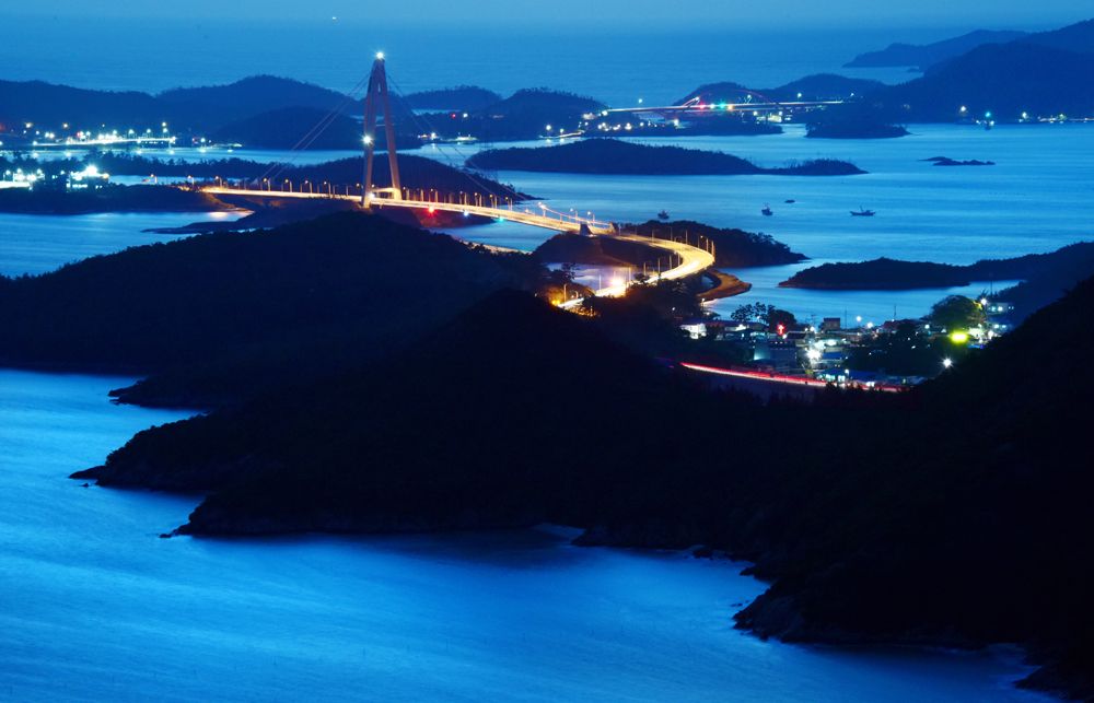 신시도 월영봉에 서면 가슴이 뻥 뚫린다. 굽이 치며 흘러가는 고군산대교의 차량불빛과 저 멀리 선유대교가 섬들을 하나로 이어주는 장쾌한 풍경을 만난다.