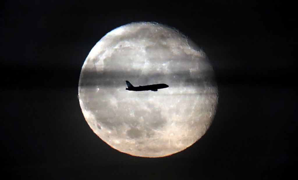 보름달 앞을 비행 중인 여객기. 달의 하루는 29.5일입니다. [사진=EPA/연합뉴스]