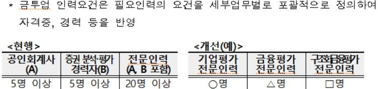 먼저 신평사의 전문인력요건을 개정한다. 앞으로 신평사들은 종전처럼 회계사 5인, 증권 분석·평가경력자 5인을 포함한 전문가 20인 이상을 갖추는 게 아니라 기업평가·금융평가·구조화금융평가 등 업무별로 자격증, 경력 등을 포괄적으로 반영해 직원을 뽑아도 된다. 재무제표, 부동산 프로젝트파이낸싱(PF) 등 파생상품 등 역량 강화를 위한 고용의 재량을 열어주는 것이다.