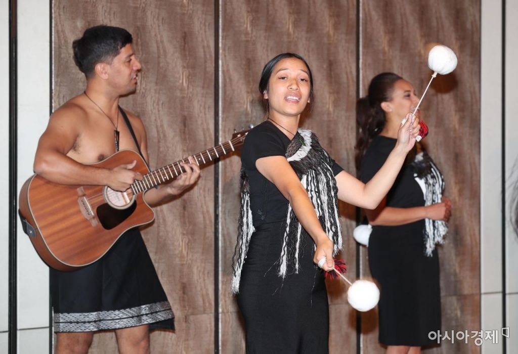 25일 서울 종로구 포시즌스호텔에서 에어뉴질랜드 주최로 열린 대한민국 인천-뉴질랜드 오클랜드 직항 노선 신규 취항 기념행사에서 뉴질랜드 관계자들이 전통춤 하카를 선보이고 있다. /문호남 기자 munonam@