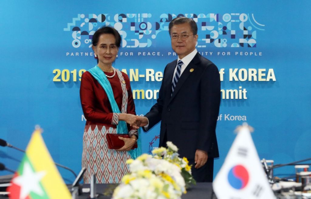 문 대통령은 정상회담에서 "양국 수교 45주년을 앞두고 한국에서 수찌 국가고문을 다시 뵙게 돼 반갑다"며 "직업, 교육, 환경, 수산 부분으로 양국 협력을 더욱 확대해 우리의 우정이 더욱 굳건해지길 기대한다"고 말했다. 문 대통령은 지난 9월 동남아 3개국 순방 당시 미얀마를 방문했던 것을 떠올리며 "양국은 지난 정상회담에서 미얀마의 지속가능한 발전 계획과 한국의 신남방정책을 연계해 경제협력산업단지 건설을 시작으로 다양한 협력 기반을 마련했다"며 "오늘 회담이 양국은 물론 한국과 메콩 국가의 공동 번영 시대를 여는 소중한 계기가 되길 기대한다"고 덧붙였다.