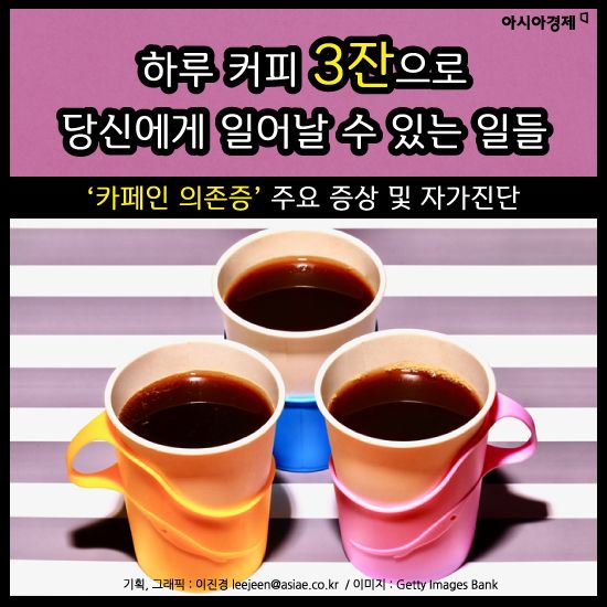 [아시아경제 이진경 기자] 하루에 카페인이 든 음료를 얼마나 먹나요? 피곤한데 할 일이 많아서 습관적으로 커피나 카페인 음료를 내내 달고 지낸다면 카페인 의존증을 주의해야 합니다. 카페인 섭취하지 않았을 때 특정 증상이나 질환을 겪는다면 카페인 의존증일 수 있습니다. 이번 기회에 자가진단해보고 카페인 의존증이 의심된다면 카페인 없는 차를 마시는 습관을 가져보는 것은 어떨까요?