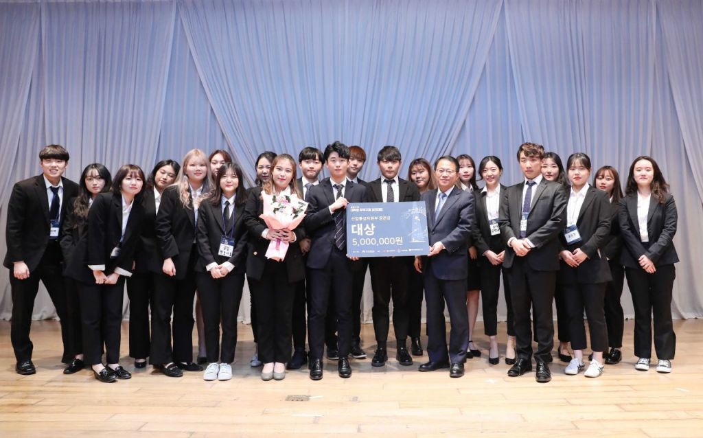 강명수 산업통상자원부 무역위원회 상임위원과 '2019 대학생 무역구제 경연대회'에서 산업부 장관상을 수상한 경희대학교 라온무역팀이 기념촬영을 하고 있다.