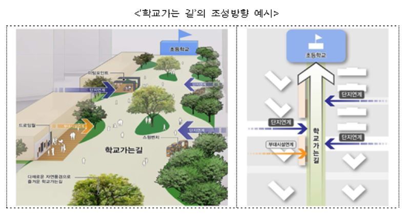 아이들의 시선에 맞춘 화초류와 계절 따라 변하는 교목 식재는 풍부하고 특색 있는 경관을 연출한다. '학교가는 길'과 엮어진 공간들은 즐거운 통학길 뿐 아니라 부모와 아이가 함께 경관을 감상하고 문화를 향유하는 소통의 중심이 되는 공간으로 탈바꿈한다는 복안이다. 보육기능이 집적된 종합보육센터와 연계한 '학교가는 길'은 지역사회와 함께하는 '열린 지역공동체 중심 공간'으로서의 공공하우징 역할을 강화한다.