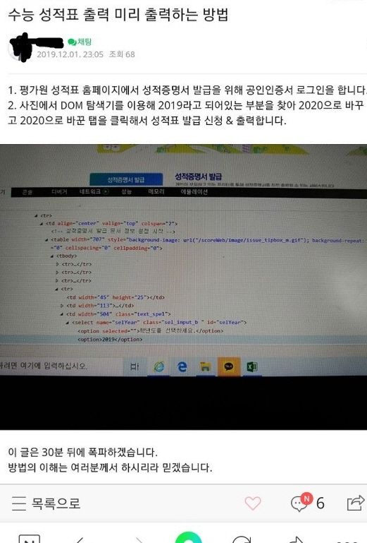 지난 1일 밤 한 수험생 커뮤니티 사이트에 '수능 성적표를 미리 발급받았다'고 인증하는 게시글이 올라왔다. 이 글을 올린 네티즌은 웹 브라우저의 개발자 도구 기능을 이용해 클릭 몇 번 만에 가능하다며 설명하는 글을 올렸다.