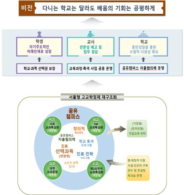 서울에서는 그동안에도 단위학교 내 개방형 선택교육과정을 통해 학생들의 희망 수요를 충족시키려 노력해 왔으나 편성 및 운영상 단위학교별 인적·물적 한계가 있었고, 학교간 협력교육과정은 주로 방과후나 주말을 이용해 운영되는 등 전체 일반고로 확대하기에는 어려움이 있었다.