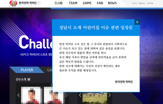 3일 한국전력 럭비단은 공식 홈페이지에 '성남시 소재 어린이집 이슈 관련 입장문'이라는 제목으로 공지를 올렸다.