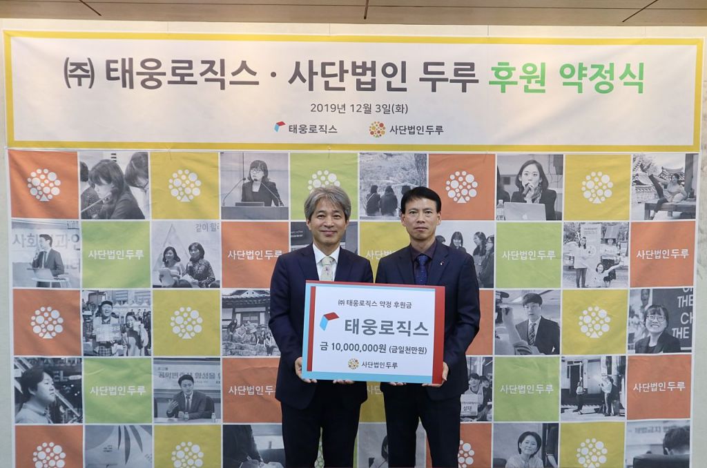 태웅로직스는 지난 3일 서울 서대문에 위치한 사단법인 두루 사무실에서 1000만 원의 금액을 후원하는 약정식을 가졌다. 태웅로직스의 후원금은 공익변호사들이 지속적이고 안정적으로 활동할 수 있도록 활용될 예정이다.