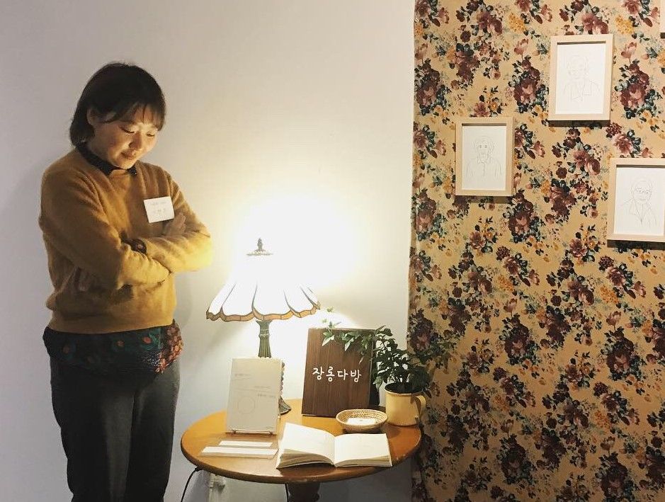 이연우 작가가 성북예술창작터에 전시된 어르신들의 이야기를 듣고 엮어 낸 단행본 '장롱다방' 앞에서 포즈를 취하고 있다. 장롱다방은 노인 이야기 들어주는 청년 예술가 프로젝트를 통해 만들어진 책이다. 이 작가 친할머니의 인생 보물상자였던 '장롱'을 컨셉으로 잡았다. 그는 "장롱이란 소재가 없이도 단순히 이야기를 듣는 행위만으로도 어르신들의 친구가 돼 인생 얘기를 들을 수 있었다"고 말했다. (제공=이연우 작가)