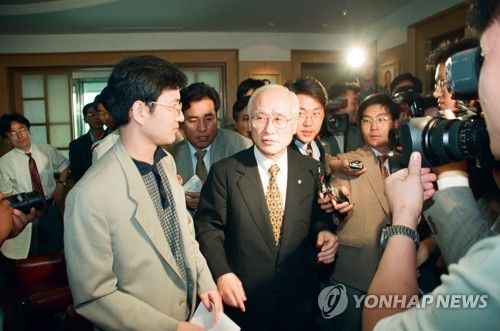 김우중 전 대우그룹 회장이 9일 수원 아주대병원에서 숙환으로 별세했다. 사진은 1998년 6월 11일 전경련회관에서 취재진 질문을 받는 당시 김우중 전경련 차기 회장 모습. [이미지출처=연합뉴스]