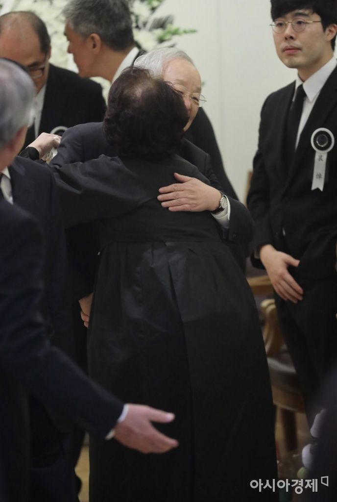 손경식 한국경영자총협회장 겸 CJ그룹 대표이사가 10일 오후 경기 수원시 아주대학교병원 장례식장에 마련된 故 김우중 전 대우그룹 회장의 빈소를 찾아 김 전 회장 부인인 정희자 전 힐튼호텔 회장을 안아주고 있다./수원=강진형 기자aymsdream@