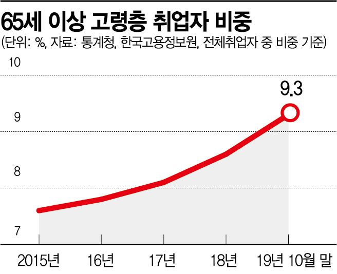 지난 10월말 기준으로 65세 이상 취업자는 전체 취업자의 9.3%에 해당하는 252만1000여명에 달했다. 전체 취업자 중에서 65세 이상이 차지하는 비중도 2015년 7.6%에서 2017년 8.1%, 지난해 8.6% 등 매년 크게 상승하고 있다.