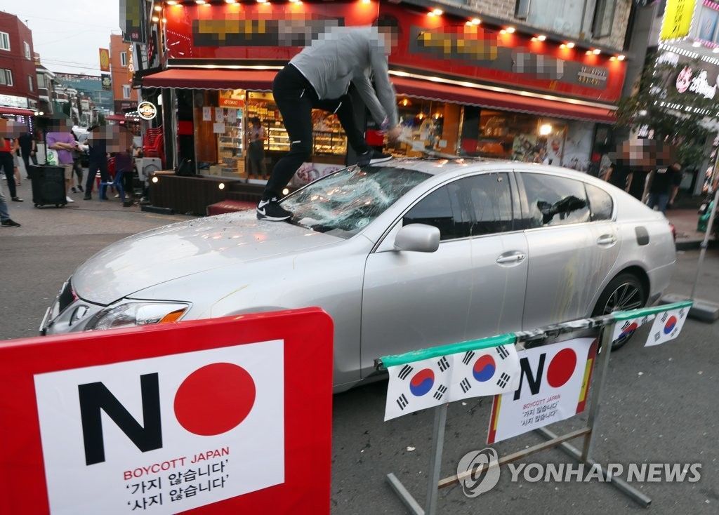 지난 7월23일 인천 구월문화로상인회 회원들이 오후 인천시 남동구 구월동 한 상가 밀집 지역에서 열린 '일본 경제보복 규탄 불매운동 선언 행사'에서 일본산 차량인 렉서스 승용차를 부수는 퍼포먼스를 하고 있다. [이미지출처=연합뉴스]