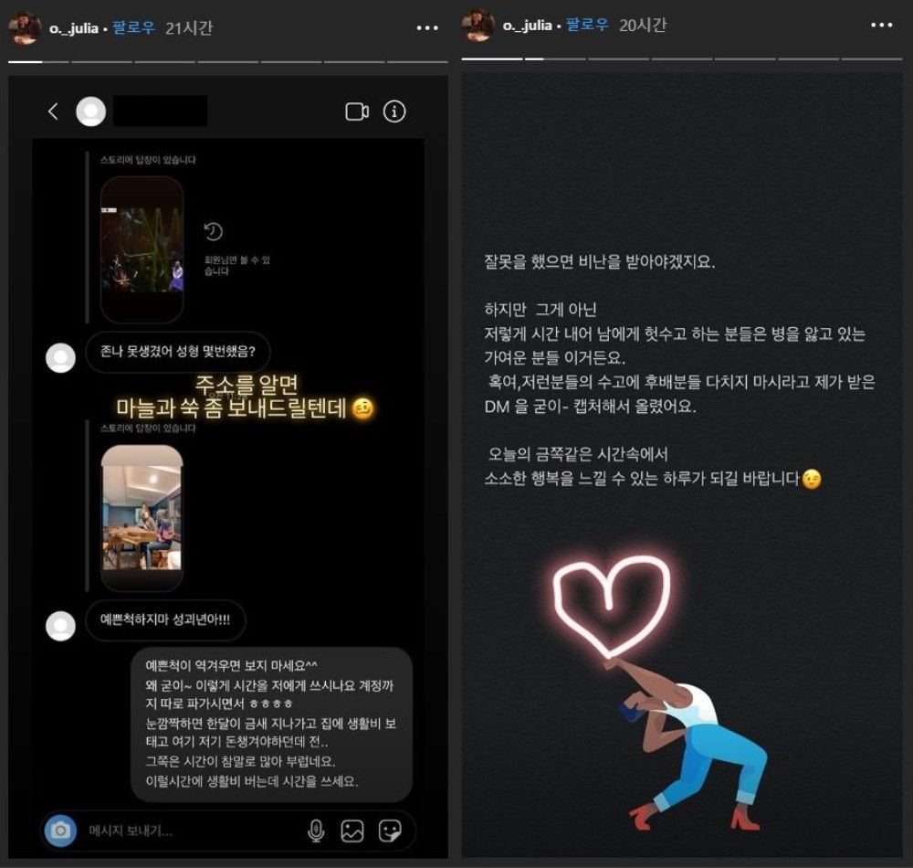 그는 악플러가 남긴 악플에 후배들이 다치지 않길 바란다는 메시지도 함께 남기며 "금쪽같은 시간 속에서 소소한 행복을 느낄 수 있는 하루가 되길 바란다"고 전했다.