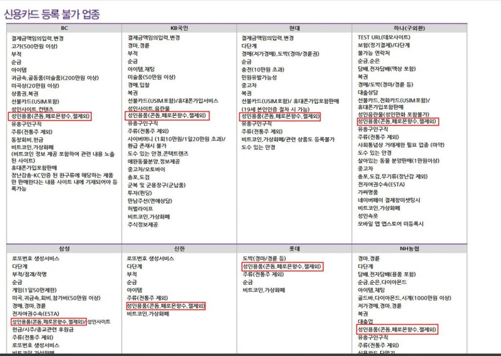 국내 한 대형 PG사(전자결제 대행업체)의 신용카드 등록 불가 업종 현황.