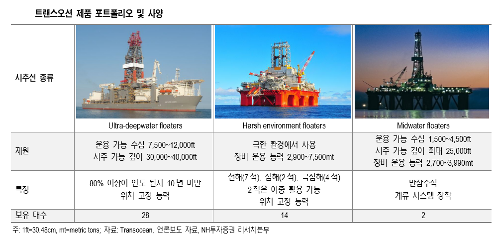 트랜스오션은 1952년 미국에서 설립돼 현재 스위스에 본사를 두고 있는 세계 1위 해양시추업체다. 현재 운영 중인 제품은 총 44대로 Ultra-deepwater floaters(28대), Harsh environment floaters(14대), Midwater floaters(2대)로 구성됐다. 트랜스오션이 보유한 해양시추선 중 대우조선해양이 12척, 삼성중공업이 12척, 이 2척을 건조했다.