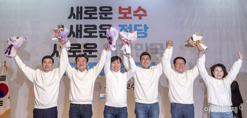 5일 국회에서 열린 새로운 보수당 중앙당 창당식에서 공동 대표로 선출된 지상욱 의원(왼쪽부터), 유의동 의원, 하태경 의원, 오신환 의원, 정운천 의원이 손을 맞잡고 당원에게 인사하고 있다. 이날 창당대회에서 새보수당은 당 대표와 최고위원 등 지도부를 공식 선출하고 정강정책 및 당헌을 채택했다./윤동주 기자 doso7@
