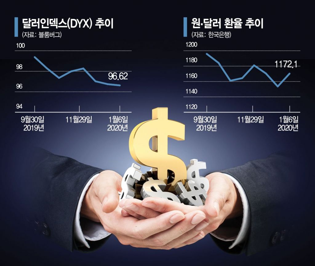 중동지역 지정학적 불확실성이 확대되며 안전자산 선호심리가 강해지고 있지만 최근 이어져온 달러약세(원화강세) 기조는 지속될 것이란 전망이 우세하다. 양국 사이의 갈등이 현재까지는 전면전으로 비화될 가능성은 낮은 것으로 예상되면서 단기간 변동성을 키우는 데 그칠 것이라는 분석 때문이다. 양국 간 갈등에도 불구하고 달러화지수는 지난해 9월30일(99.38포인트) 고점 이후 내림세를 이어가고 있다. 블룸버그에 따르면 달러인덱스(DYX)는 전날에도 전 거래일 대비 0.22% 내린 96.62포인트로 마감하며 약세 흐름을 이어갔다.