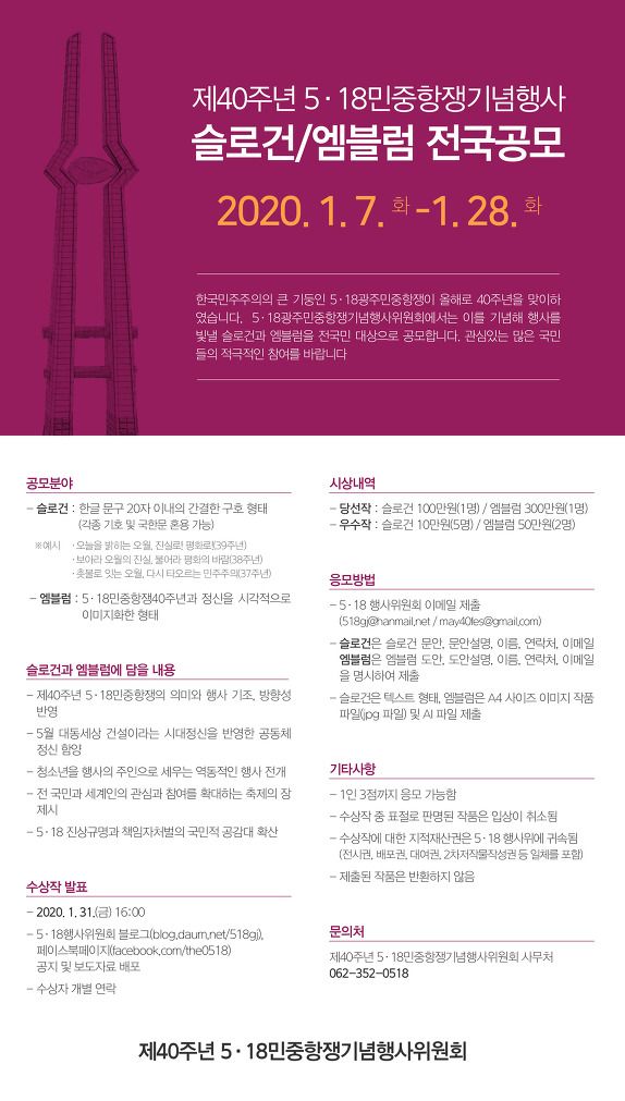슬로건은 20자 이내 간결한 구호 형태, 엠블럼은 5·18민주화운동 40주년과 정신을 시각적으로 이미지한 형태로 A4 사이즈 이미지 파일(jpg) 또는 AI 파일로 제출하면 된다.