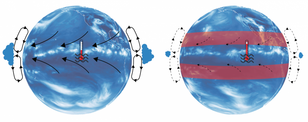 왼쪽 그림은 현재 기후 조건에서의 해들리 순환 모식도다. 양옆의 고리는 열대에서 상승해 아열대에서 하강하는 공기를 나타낸다. 오른쪽 그림은 지구 온난화에 따라 열대 지역의 온도가 높아지는 그림이다. 아열대 지역의 온도가 높아지면 해들리 순환이 약화되고(점선), 열대 지역에서 구름 양이 감소하며, 차가운 해수의 용승이 감소하게 된다. 그 결과 열대 지역의 온도가 상승하게 된다.