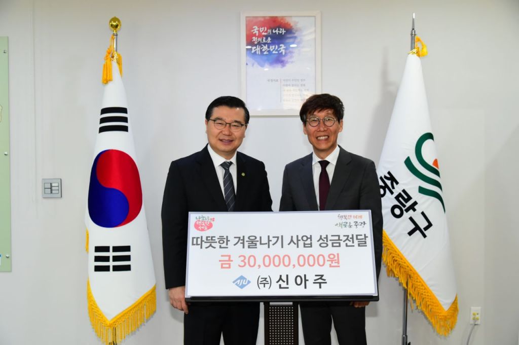 류경기 중랑구청장은 “기부영웅이신 고 문태식 아주그룹 명예회장의 뜻을 이어 매년 지역 저소득주민을 위해 따뜻한 마음으로 후원해 주는 문재영 회장님을 비롯한 신아주 관계자분들께 깊이 감사드린다”며 “후원금을 도움이 필요한 곳으로 잘 전달하겠다”고 밝혔다.