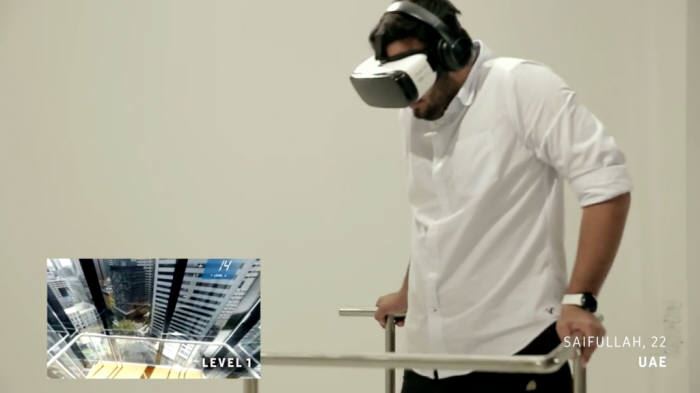 삼성전자 VR 치료 실험 `Be Fearless` 참가자가 HMD `기어VR`을 착용해 가상 환경을 통해 고소공포증을 치료하고 있다. 왼쪽 하단 작은 화면이 VR에서 보여지는 가상 환경.