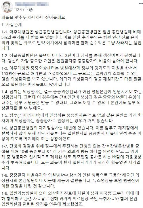 앞서 지난 14일 또 다른 아주대 의대 현직 교수 김 모 교수는 자신의 페이스북에 올린 글에서 "본관 병실이 펑펑 남아도는데 외상환자를 받아주지 않았다고 하는 건 사실이 아니다"고 밝혔다.