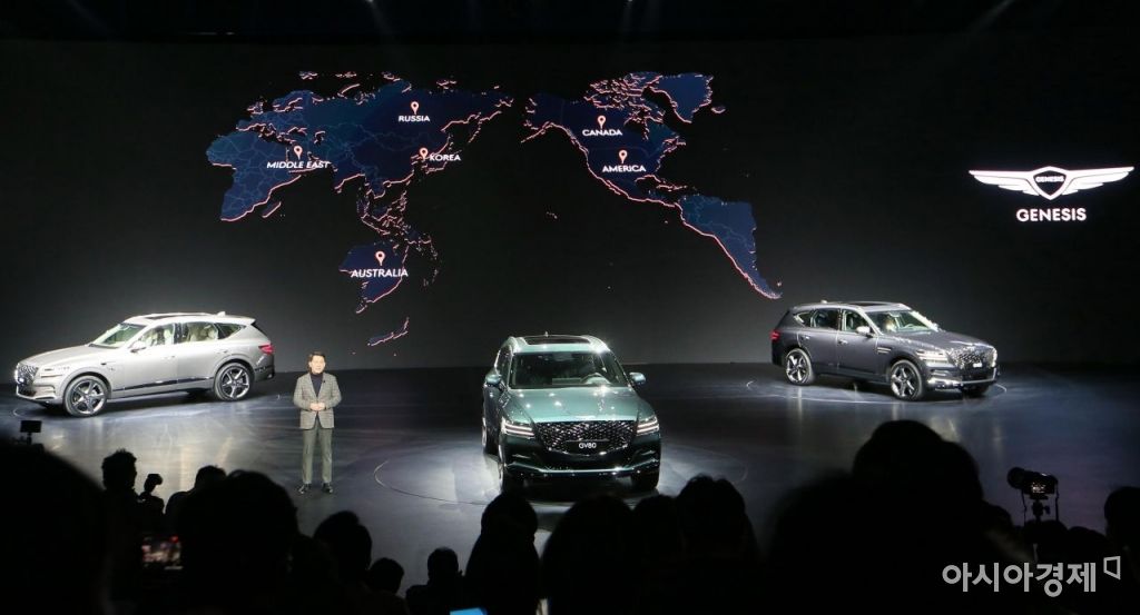 현대자동차그룹 고급 브랜드 제네시스의 첫 SUV(다목적스포츠차량) 'GV80'가 공식 출시됐다. 현대차그룹은 15일 경기 고양시 킨텍스에서 신차발표회를 열고 공식 판매에 돌입했다. GV80은 제네시스가 처음 선보이는 후륜구동 기반의 대형 SUV다./고양=김현민 기자 kimhyun81@