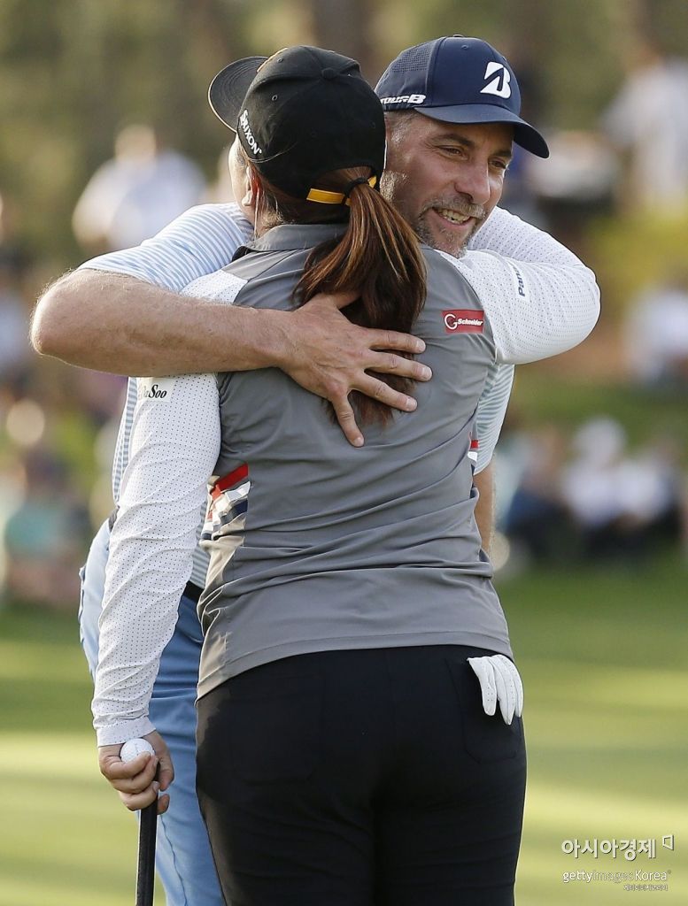 존 스몰츠가 다이아몬드리조트토너먼트 최종일 박인비와 동반 플레이를 펼친 뒤 포옹을 하고 있다. 스몰츠는 대회 2연패를 달성했다. 레이크부에나비스타(美 플로리다주)=Getty images/멀티비츠
