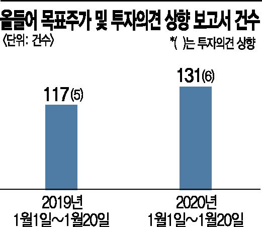 21일 금융정보업체 에프앤가이드에 따르면 올 들어 20일까지 나온 목표주가 상향 보고서는 131건이다. 전년 같은 기간 117건에 비해 약 12% 증가한 수치다. 투자의견 상향도 지난해 5건에서 올해 6건으로 1건 늘었다.
