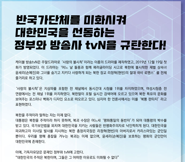 자유당은 지난 8일 성명을 통해 "'사랑의 불시착'은 지상파를 포함한 전 채널에서 동시간대 시청률 1위를 차지하였으며, 여성시청층 전 연령에서는 전 채널 1위를 차지했다"면서 "북한말이 포털 실시간 검색어에 오르고 있으며 북한 특유의 문화를 보여주는 포스터나 벽화가 디자인 요소로 떠오르고 있다. 심지어 한 언론사에서는 이를 '북뽕 판타지' 라고 표현했다"고 지적했다.