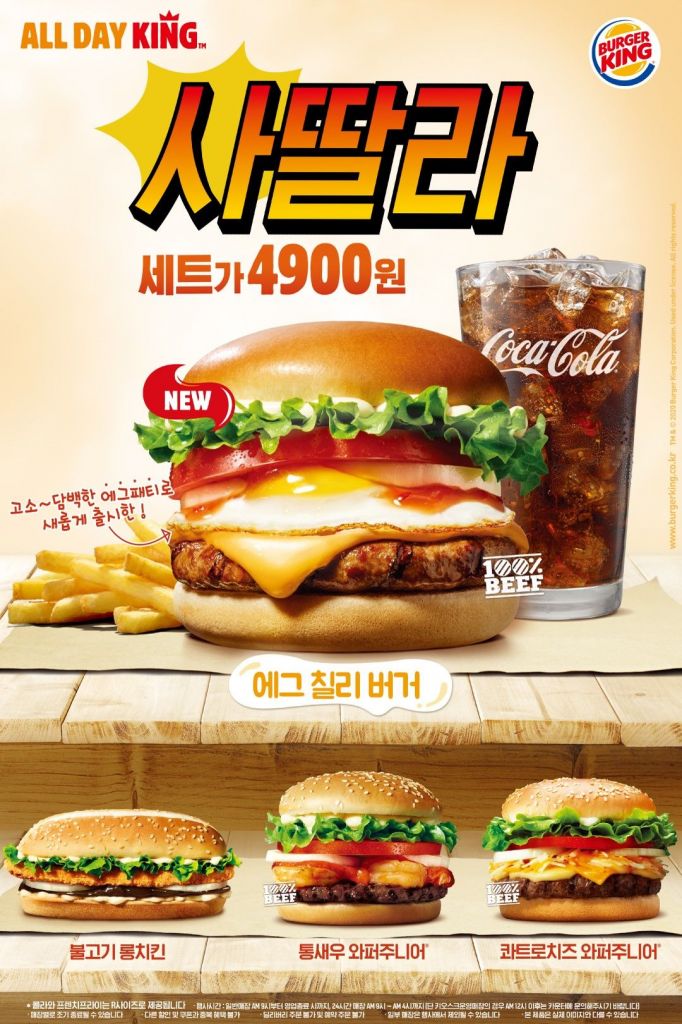 새롭게 리뉴얼된 ‘사딸라 올데이킹’ 메뉴는 신규 메뉴인 에그칠리버거를 비롯해 불고기 롱치킨, 통새우 와퍼주니어, 콰트로치즈 와퍼주니어로 총 네 가지이다. 사딸라 올데이킹에서만 맛볼 수 있는 에그 칠리 버거는 푹신하고 부드러운 식감의 에그번에 100% 순쇠고기 패티, 고소하고 담백한 에그패티, 그리고 매콤한 칠리소스가 조화롭게 어우러져 풍부한 맛을 자랑한다.