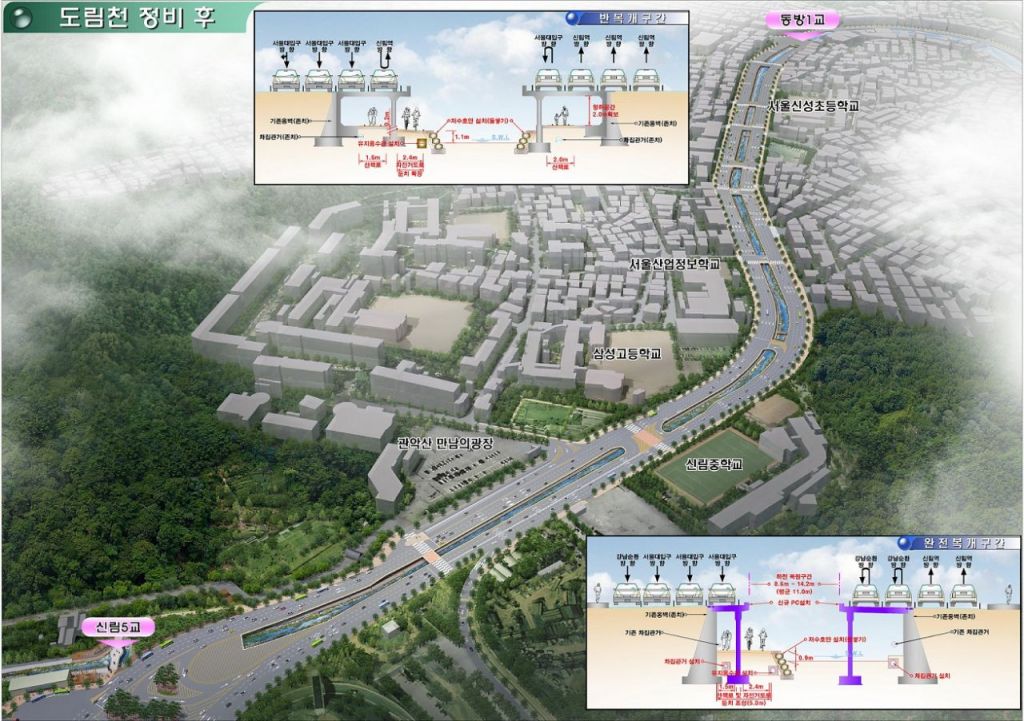 현재는 마지막 복개구간인 서울대정문 앞~ 동방1교 도림천 상류부 개복작업만을 남겨둔 상황이다.