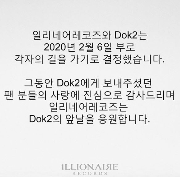 일리네어레코즈는 6일 오후 공식 인스타그램에 "일리네어레코즈와 Dok2는 2020년 2월6일 부로 각자의 길을 가기로 결정했다"고 밝혔다.