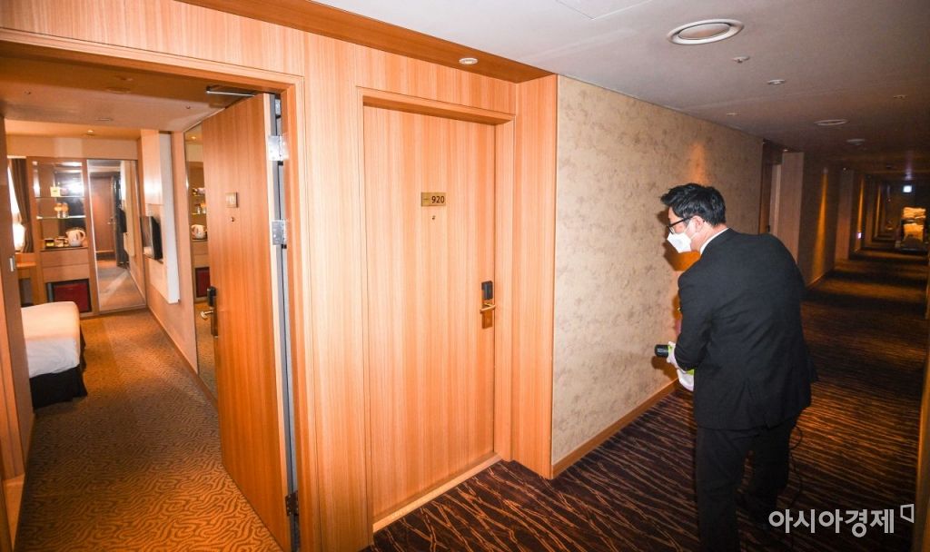 14일 서울 중구 서미트호텔에서 호텔 직원이 객실 내부 및 복도 방역을 하고 있다./강진형 기자aymsdream@