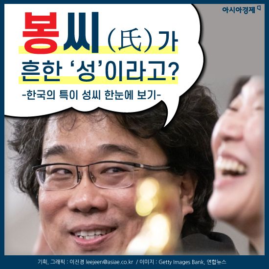[아시아경제 이진경 기자] 최근 영화 ‘기생충’이 2020 아카데미 시상식에서 4관왕을 수상한 봉준호 감독이 큰 주목을 받고 있습니다. 그런데 봉준호 감독 이름은 매체를 통해 자주 접해 익숙하지만 어쩐지 그의 성씨인 ‘봉’은 자주 들어본 성씨가 아니라서 조금은 생소하게 느껴지지 않나요? ‘봉’씨처럼 우리나라에 존재하는 성씨 중에 깜짝 놀랄만한 희귀 성씨가 꽤 있다고 합니다. 희귀 성씨를 가진 유명인은 누가 있는지 살펴봅시다.또 현재 우리나라 존재하는 희귀 성씨들은 무엇이 있는지도 알아봅시다.