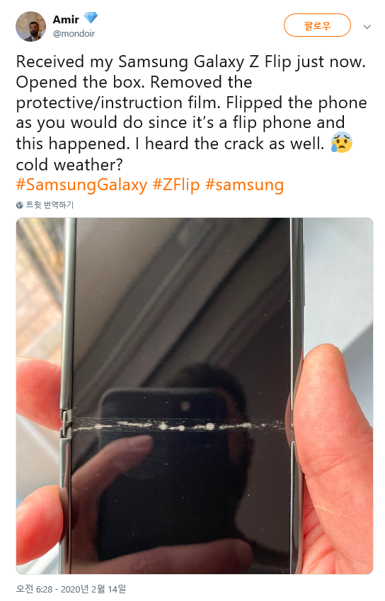 18일(현지시간) 갤럭시Z 플립을 구매한 아미르 씨는 트위터에 디스플레이에 균열이 생긴 자신의 갤럭시Z 플립 사진을 공개했다. 사진 속 갤럭시Z 플립 화면 가운데에 선명하게 금이 가있다. 삼성전자 측은 해당 제품을 회수하고 문제 파악에 나섰다.