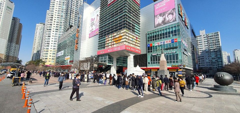 24일 오전 대구 북구 이마트 칠성점에서 시민들이 마스크를 사기 위해 줄지어 서 있는 모습. [이미지출처=연합뉴스]