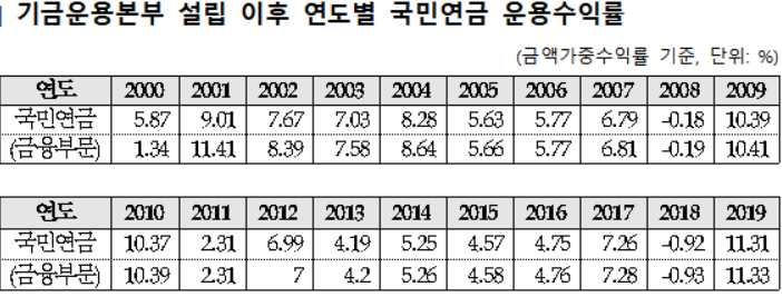 국민연금의 최근 10년간 수익률은, 2010년 10.37%, 2011년 2.31%, 2012년 6.99%, 2013년 4.19%, 2014년 5.25%, 2015년 4.57%, 2016년 4.75%, 2017년 7.26%, 2018년 -0.92% 등으로 집계됐다.