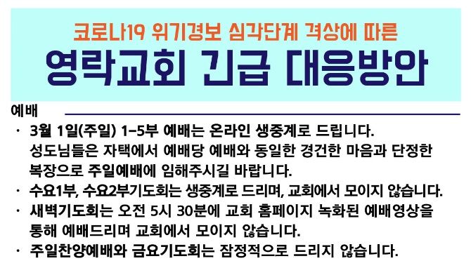 영락교회는 다음 달 1일 1~5부 예배는 온라인 생중계로 전환한다고 이날 홈페이지에 공지했다. 충현교회도 코로나19 확산으로부터 신도와 지역사회를 보호하기 위해 내달 1일과 8일 예배를 중단하고, 유튜브 채널을 통해 생중계한다고 밝혔다.