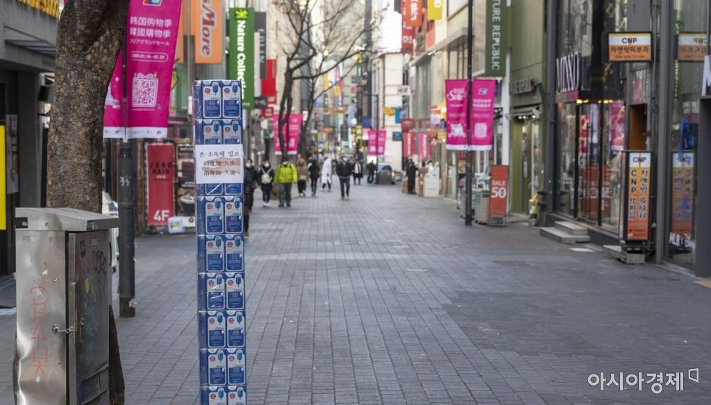 신종 코로나바이러스 감염증의 영향으로 9일 서울 명동 쇼핑거리가 주말임에도 불구하고 한산한 모습을 보여주고 있다./윤동주 기자 doso7@