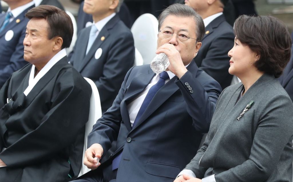 문재인 대통령이 1일 종로구 배화여고에서 3.1절 기념사 후 자리로 돌아와 물을 마시고 있다. [사진=연합뉴스]