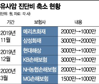 3일 손해보험업계에 따르면 NH농협손해보험은 이달부터 유사암 진단비를 2000만원에서 1000만원으로 축소했다. MG손해보험도 최대 1500만원이던 유사암 진단비를 1000만원으로 줄였다. 현재 2000만원까지 보장하고 있는 삼성화재도 조만간 한도를 줄일 것으로 알려졌다.