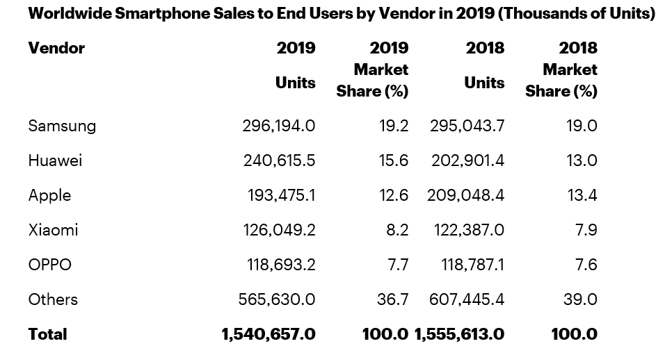 화웨이는 2019년 판매량이 18.6% 증가하며 가장 높은 성장률을 달성했다. 다만 미국과 무역 분쟁으로 인해 4분기에는 애플에 2위 자리를 내줬다. 애플은 아이폰11 가격을 전작보다 낮추고 이전 세대 모델 가격까지 인하하면서 4분기 기준 아이폰 판매량이 7.8% 증가한 것으로 나타났다. 유럽과 남미, 인도 지역에서 큰 성과를 거뒀고 특히 중국에서 아이폰 판매량이 4분기 기준 39%나 증가했다. 샤오미는 '레드미' 모델로 아시아와 태평양 지역 개도국에서 성과를 거뒀다.