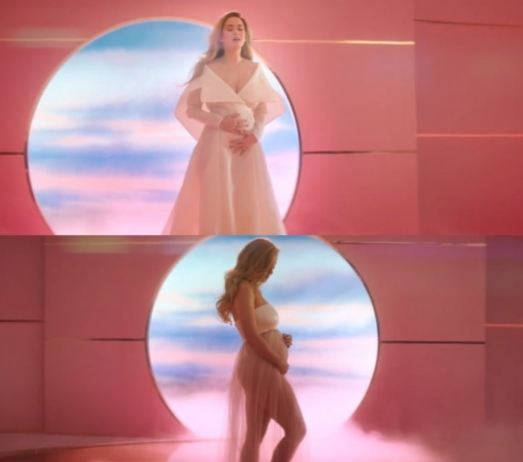 5일(한국시각) 공개된 케이티 페리의 신곡 '네버 원 화이트(Never Worn White)' 뮤직비디오에는 드레스를 입고 볼록한 배를 어루만지는 케이티 페리의 모습이 담겼다.